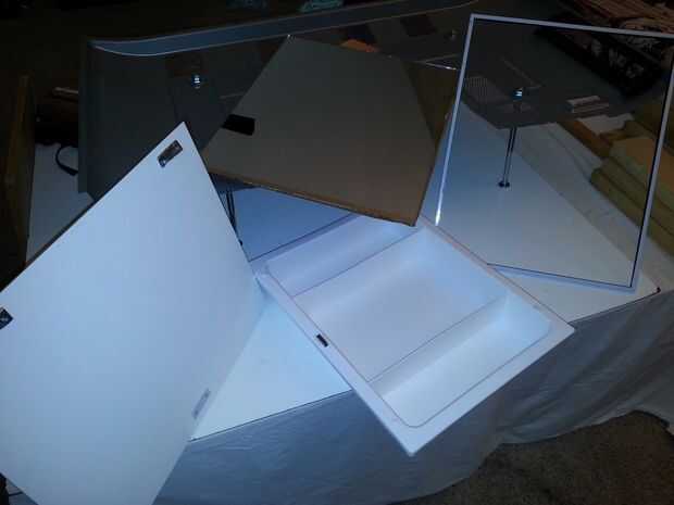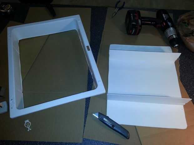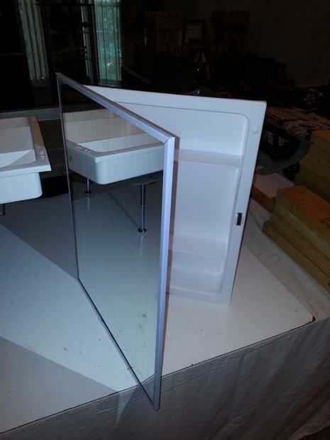 Tuve un tiempo difícil encontrar espejos que funcionarían y quería añadir doble espejos del infinito. Mientras yo estaba vagando por la ferretería, vi una pila de botiquines. No sólo tenía los espejos de tamaño perfecto, pero el gabinete de plástico era la profundidad perfecta. Desmontar el espejo del gabinete y cortar la parte inferior del gabinete.