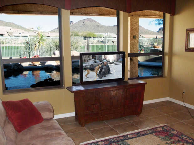 El dueño de esta casa tenía una TV de pantalla plana en la habitación, sentado encima de un mueble de madera rústica. Sólo veía lo de vez en cuando, para ve la mayoría de las veces fue solo una monstruosidad lo que tapaba parte de su ventana. Pensó en conseguir (o hacer) un mueble de TV de Pop para ocultar la TV, pero no quiso reemplazar o modificar los muebles que ya tenía en la habitación.