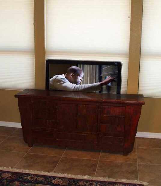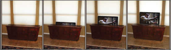 Solucionó el problema mediante un sistema de elevación de TV para montar la televisión detrás del gabinete. El sistema de elevación se hace por Nexus 21 y es sólo de 23" de alto. Se podría también han sido montado detrás de un sofá u otra pieza de mobiliario. Este modelo viene con un control remoto y un soporte universal para TV de hasta 42".