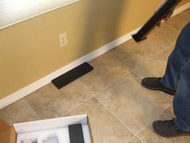 La Junta de montaje inferior es opcional y no está incluida con el sistema de elevación. Decidimos crearlo así que podríamos fijar la columna elevadora para en lugar de la planta, que era de cerámica. Es sólo una pequeña porción de 1/2" madera contrachapada gruesa, que hemos pintado negro. No es realmente necesario fijar el tablero al piso porque la mayor parte del soporte de carga para la elevación de la TV viene del soporte de pared. La Junta de montaje inferior realmente sólo le da un lugar para fijar la parte inferior de la elevación y distribuye la carga un poco mejor.