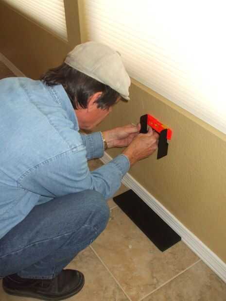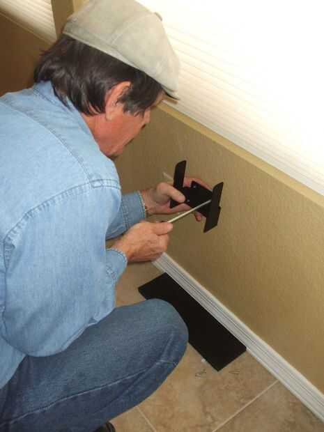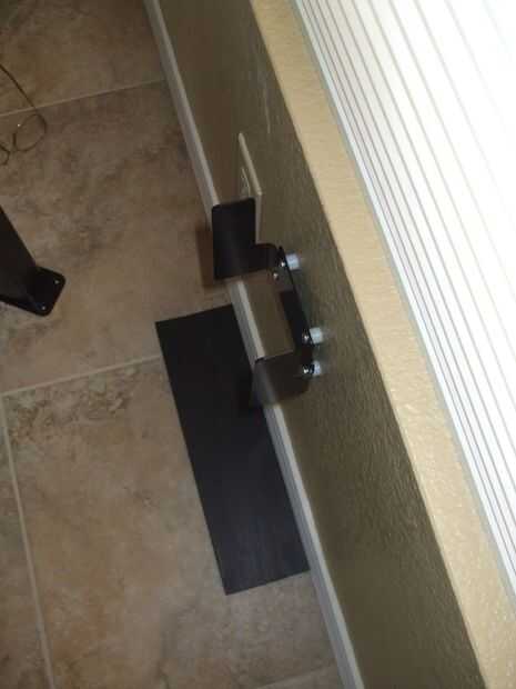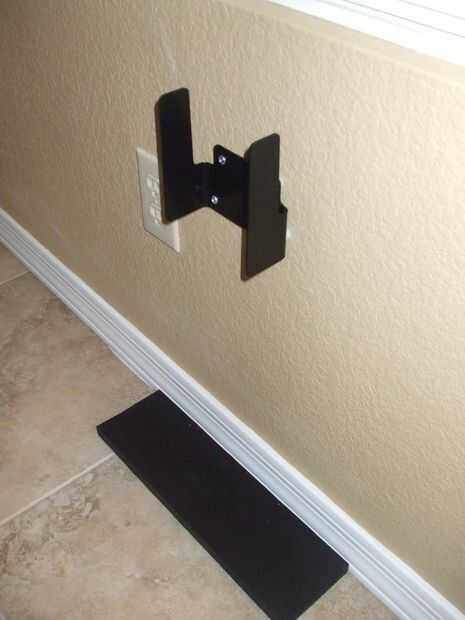 Hay 4 espaciadores de plástico blanco visible entre el soporte y la pared. Estos llegaron con la elevación de la TV y nos ayudó a mover la Asamblea adelante lo suficiente como para limpiar la madera base de moldeo en el nivel del suelo, eliminando la necesidad de cortar en lo.