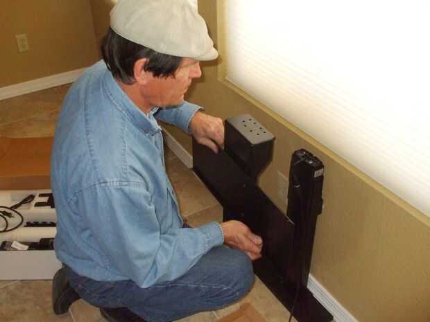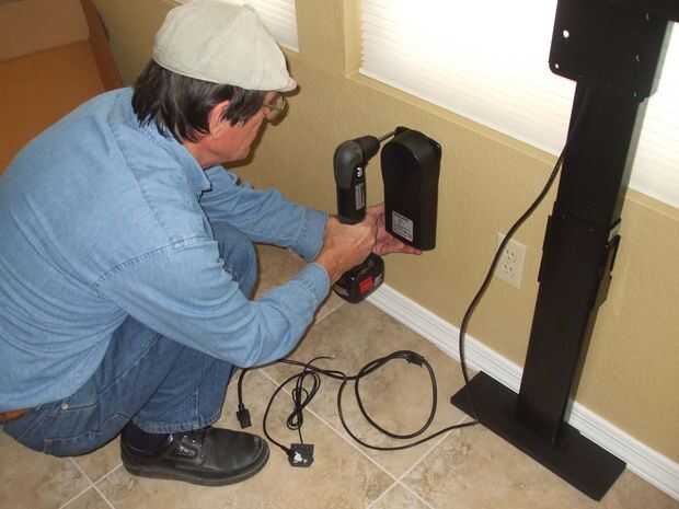 La caja de control del ascensor es un componente separado y puede ser montada en cualquier lugar. Optamos por colocarlo en la pared, por lo que terminó por detrás de la TV. Los enchufados en el poder y el cable del motor.