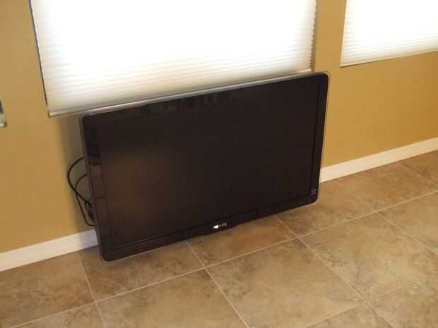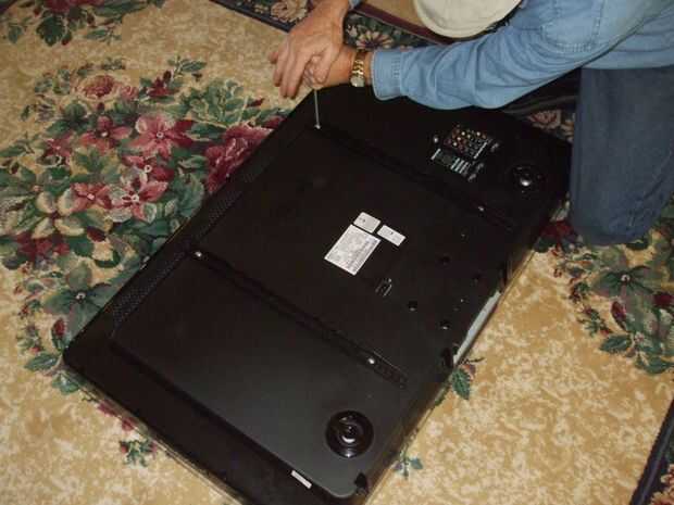 Los pernos que encajan en los agujeros en la parte posterior de la TV son los mismos tornillos que fijan el base del pedestal en la parte inferior de la TV. Una vez que quitamos la base, tuvimos los pernos adecuados para fijarle las barras de montaje.