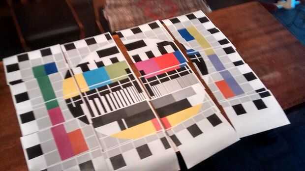 El coverscreen se hace sacando una pantalla de proyección de su soporte y una tarjeta de prueba grande (imagen 2) la pintura en él o haciendo un mosaico con papel (imagen 3).
