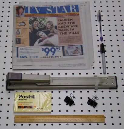 engrapadora de largo alcance: útil para muchos usos domésticos, no en tiendas de suministros de oficina por menor, pero ofrecen por $30 en sus sitios web. He comprado mía por correo de buyonlinenow.com, aproximadamente la mitad que, incluyendo envío y manejo y puede colocar una grapa 13 pulgadas desde el borde de una página. Nombre de la mina es Sparko, pero creo que la calidad de todas las marcas son iguales y son probablemente todos en la misma fábrica en China. Primero intenté doblar un lado de las páginas del programa de TV sobre un par de veces por lo que pude llegar a grapas para el doblez del centro usando una grapadora convencional, pero el montón de papel impidió la grapadora de cerrar y apretar las grapas.