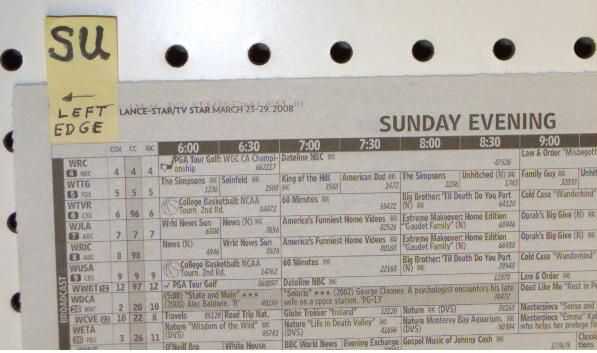 Cada ficha debe adherirse justo por encima de la rejilla de programación de su día noche y ser lo suficientemente largos para que su parte superior sobresalga aproximadamente tres cuartos de una pulgada por encima del borde superior del periódico. Abreviar cada día de la semana en el lado no adhesivo del final no-pegajosa de una ficha con el rotulador, que se purga a través del papel amarillo, después trazar las letras de bled a través al otro lado de cada ficha. Las letras en algunas de mis lecturas de fichas hacia atrás cuando se mira desde la portada. Mi periódico imprime constantemente los horarios de tarde de algunos días en las páginas derechas y otros en páginas de izquierda. Las fichas que tienen sus letras al revés rápidamente me dicen que esos días están en las páginas izquierdas. Abreviado aquellos días con dos letras para hacer rápidamente obvio que aparecen al revés y que las abreviaturas de día sin ambigüedades. Las fichas pueden ser reutilizadas muchas veces y conservan su adherencia, y después de varios meses todavía tengo que hacer un segundo conjunto. Determina un espacio más o menos uniforme entre las pestañas por el experimento, luego había marcado cada uno con la ubicación en la parte superior de la rejilla de su día donde se debe colocar en cada nuevo horario semanal. La foto muestra la ficha de domingo marcados y colocados en el borde izquierdo de la cuadrícula de noche para la página izquierda del domingo.