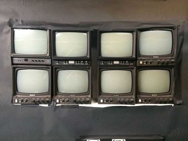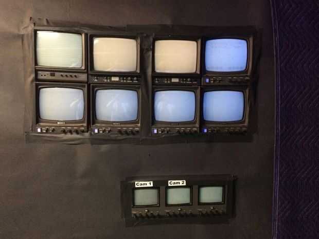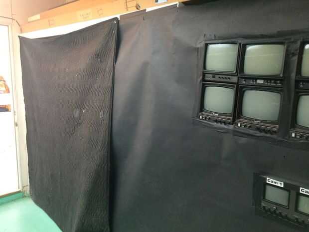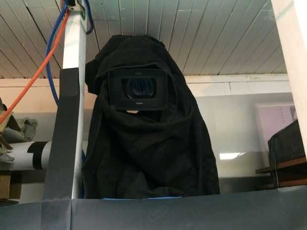 La cámara de vídeo es sobre la parte superior del papel, por lo que todavía pueden ver gente mirando los monitores. Envuelve el paño negro alrededor del trípode para encubrir así. En la oscuridad, es sorprendentemente difícil de ver la cámara.