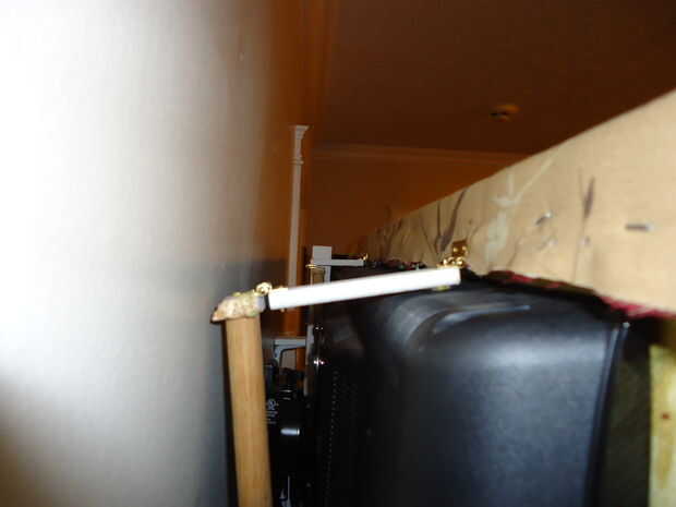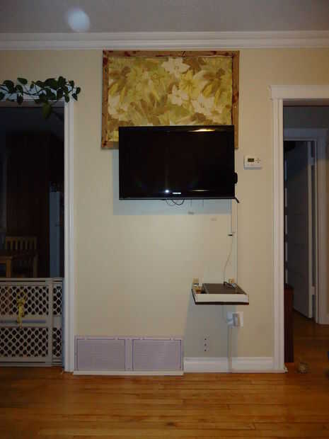 Para resolver tanto los problemas, decidí ocultar el televisor detrás del arte de la tela y poner el reproductor de DVD en un estante plegable. Ahora, cuando sólo estoy colgando hacia fuera en la sala de estar, no tengo que mirar las aburridas cajas negras. Esto es personalizado y dependerá de los espacios libres y la altura del techo que tienes, pero espero que proporciona algunas ideas!