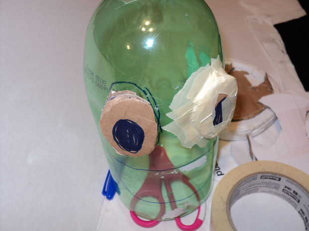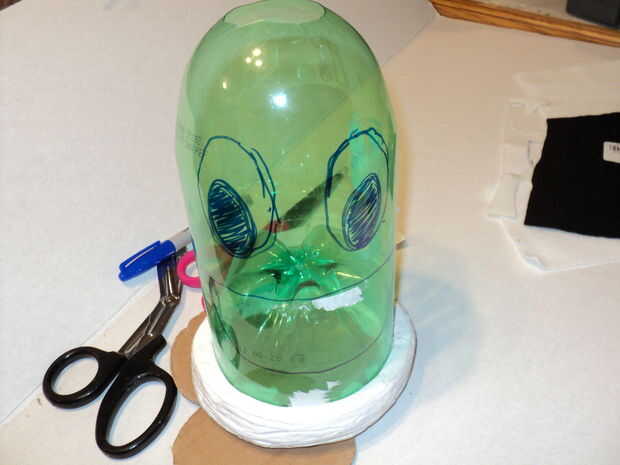 Usé pegamento caliente para juntar esto y virar a la botella. El pegamento caliente estaba lo suficientemente caliente como para deformar el plástico de la botella un poco. Supongo que una pistola de pegamento de baja temperatura habría funcionado mejor.
