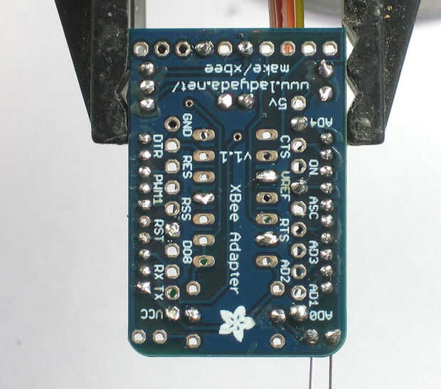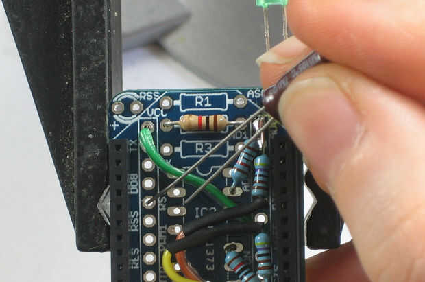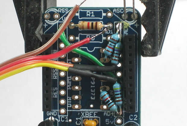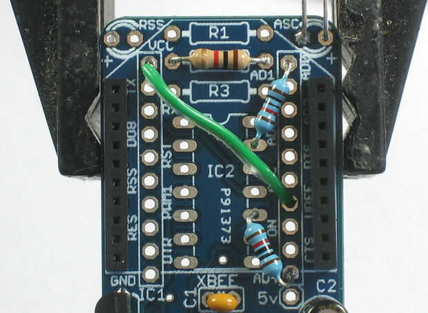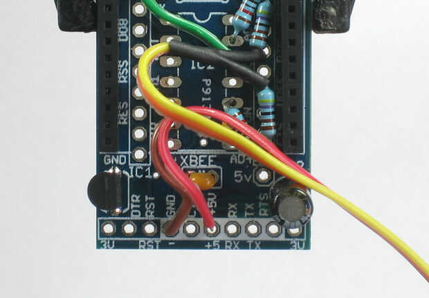 La costumbre de condensador introducir debajo del módulo XBee hasta darle cierta longitud de cable para que el grueso cilíndrico está junto a los 3, 3V regulador.