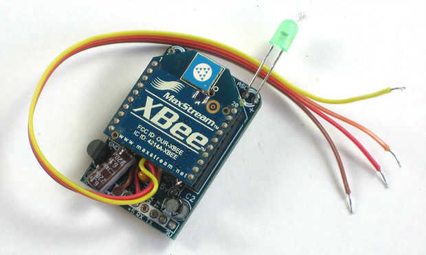 ... y lo debe parecerse con el XBee módem instalado. Asegúrese de que los pernos en la línea de XBee para arriba con el encabezado.