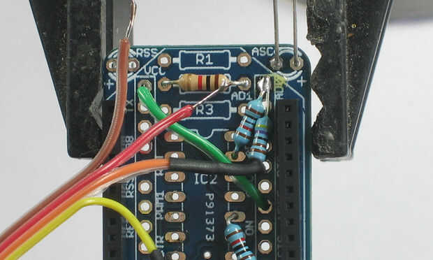 Ahora viene la parte difícil. Nos vamos a conectar el otro extremo de la resistencia de 4,7 K al pin AD0 pero el resistor de 10K ya existe. Utilice el soldador para fundir una gota de soldadura en la parte superior de la resistencia de 10K y luego piggyback 4,7 K resistencia por soldadura a la parte superior de la resistencia de 10 K.