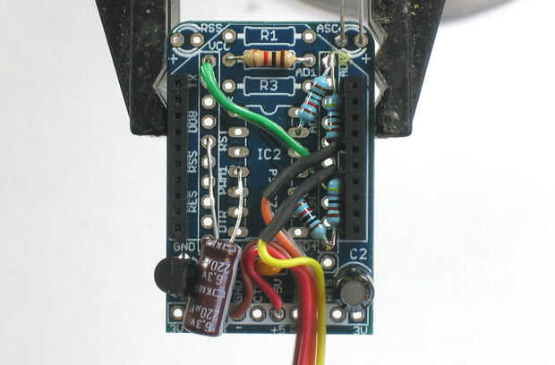 Casi hemos terminado con el adaptador de soldadura. Por último está que el 220uF reset condensador. A esto conectamos al pin RST, 5 desde la parte superior de la izquierda. Asegúrese de que la cabeza larga está conectada al pin de RST y el cable más corto va al pin 4 de donde iría el chip. Compruebe la foto de la izquierda para asegurarse de que tienes derecho.