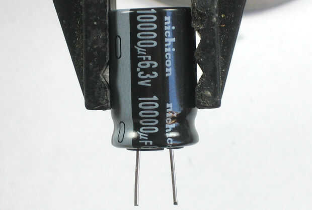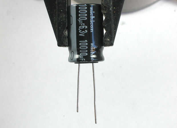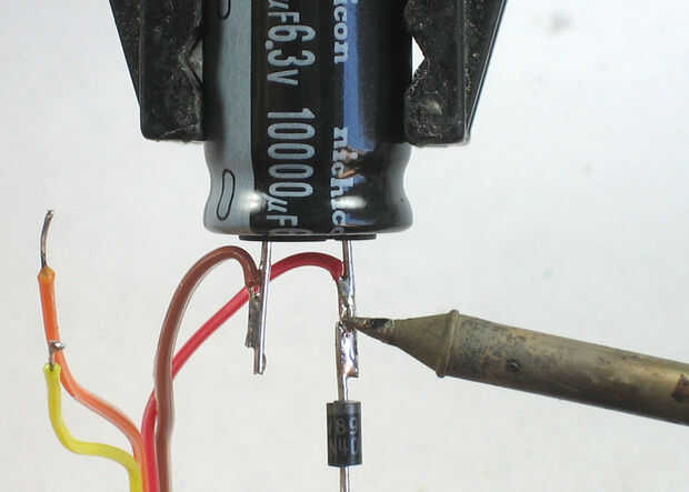 Clip del plomo del cátodo hacia abajo del diodo 1N4001, que es el extremo con la raya blanca. en él. Soldar el diodo para que al lado de la raya blanca está conectado a la patilla positiva del condensador grande.