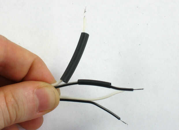 Tome la cinta blanco y negro de antes. Split, la tira y los cuatro extremos de la lata. Cortar 1" pedazo de 1/8" termoencogibles y deslice en el cable blanco. Deslice una 1/2" pieza de 1/16" calor del encogimiento en el cable negro.