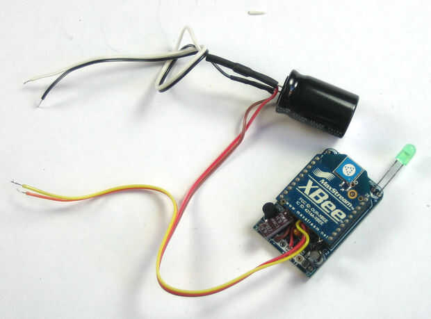 Suelde el otro extremo del cable de cinta roja (que va a + 5V en el adaptador XBee) a la patilla positiva del condensador.