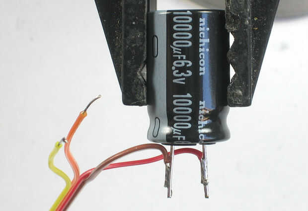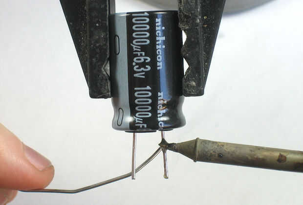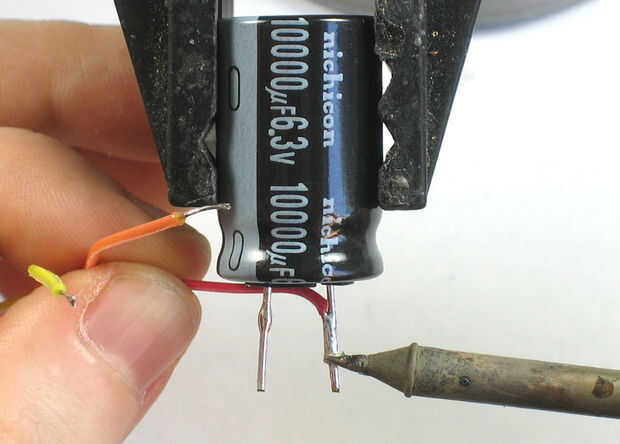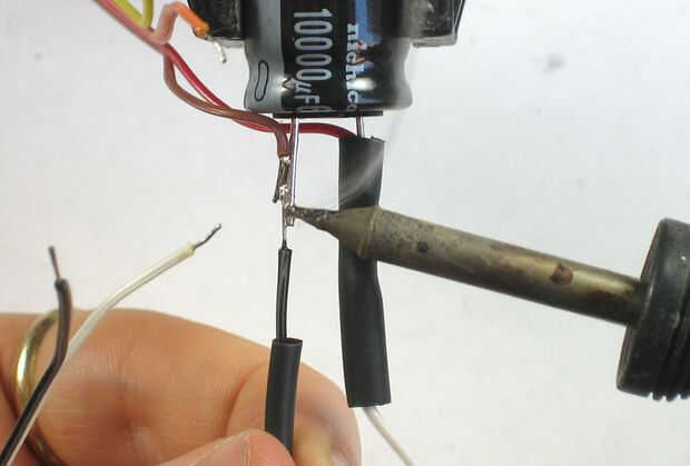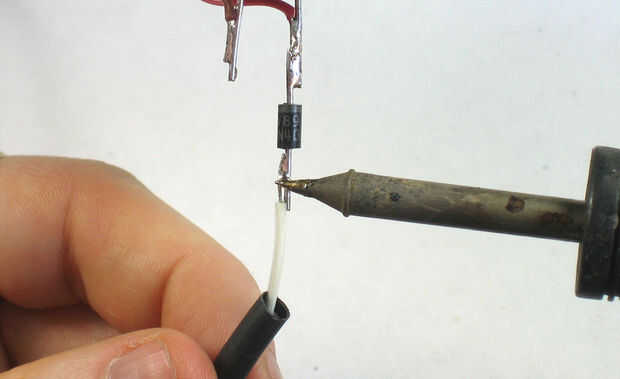 Enganche el otro extremo del diodo (el lado sin una raya blanca) y soldar el cable blanco a él. Suelde el cable negro a la patilla negativa del condensador grande.