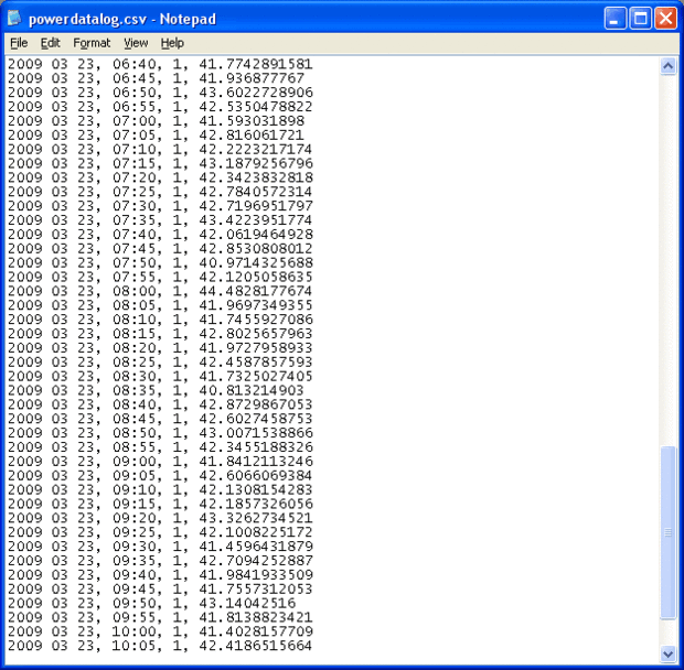 Es bueno tener estos datos pero sería aún mejor si podríamos guardarla para su uso. Bueno, eso se hace automáticamente para usted! Puede establecer el nombre del archivo de registro en el script de wattcher.py. Por defecto es powerdatalog.csv. La secuencia de comandos recopila datos y escrituras de cada 5 minutos una sola línea en el formato año mes día, hora, Sensor #, Watts para cada sensor. Como se puede ver, este es un ejemplo de una bombilla incandescente de 40W enchufado durante unas horas. Debido a la velocidad de muestreo baja, verás que algunas pequeñas variaciones en la potencia registran. Estos datos pueden importarse fácilmente en cualquier programa de hoja de cálculo