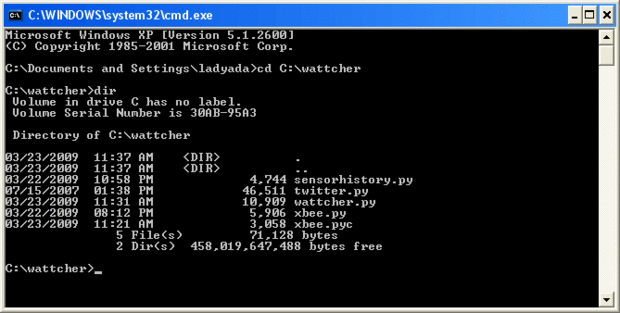 Ejecute el comando cd C:\wattcher para llegar al lugar donde usted sin comprimir los archivos. Ejecutando el comando dir se puede ver que tienes los archivos en el directorio