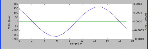 Convertidor de Analógico/Digital de XBee está configurado para tomar una 'instantánea' de un ciclo de seno a la vez. Cada muestra doble (voltaje y corriente) es desmontar 1ms y tarda 17 de ellos. Se traduce en un tren largo de 17ms de muestras. Un ciclo de uso de la energía es 1 / 60Hz largo que es 16.6ms. Así que funciona bastante bien!
