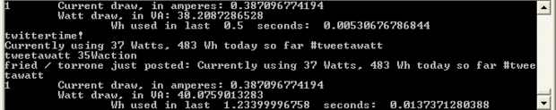El XBee envía los datos a la computadora que, en un script en python, las figuras lo que el voltaje (calibrado) y el amperaje en cada muestra y se multiplica cada punto para obtener los vatios utilizados en ese ciclo. Ya no hay casi ningún dispositivo que cambia los usos de energía de ciclo a ciclo, la instantánea es un buen indicador de la general uso de la energía ese segundo. Luego una vez cada 2 segundos, una sola instantánea se envía al receptor XBee