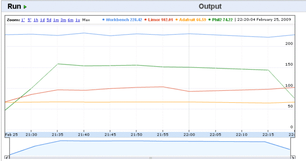 google.visualization.Query.setResponse({'version':'0.5', 'reqId':'0', 'status':'OK', 'table': {cols: [{id:'date',label:'Date',type:'datetime'},{id:'watts1',label:'Limor',type:'number'},{id:'watts5',label:'Workbench',type:'number'},{id:'watts2',label:'Adafruit',type:'number'},{id:'watts4',label:'Phil2',type:'number'}],rows: [{c:[{v:new Date(2009,1,25,21,20,2)},{v:64.8332291619},,,{v:null}]},{c:[{v:new Date(2009,1,25,21,20,3)},,{v:230.122099757},,{v:null}]},{c:[{v:new Date(2009,1,25,21,20,3)} ,,, {v: 65.4923925044}, {v: null}]}, {c: [{v: Date(2009,1,25,21,20,4) nuevo},,, {v: 48.6947643311}]}, {c: [{v: Date(2009,1,25,21,25,3) nuevo},, {v: 228.409810208}, {v: null}]}, {c: [{v: Date(2009,1,25,21,25,3) nuevo}, {v: 67.3574917331}, {v: null}]}, {c: [{v: Date(2009,1,25,21,25,3) nuevo},,, {v: 66.0046383897}, {v: null}]}, {c: [{v: Date(2009,1,25,21,25,4) nuevo},,, {v: 47.3892235642}]}, {c: [{v: Date(2009,1,25,21,30,2) nuevo}, {v: 84.9379517795},,, {v: null}]}, {c: [{v: Date(2009,1,25,21,30,3) nuevo},,, {v: 99.7553490071}]} , {c: [{v: Date(2009,1,25,21,30,5) nuevo},, {v: 229.73642288}, {v: null}]}, {c: [{v: Date(2009,1,25,21,30,6) nuevo},,, {v: 66.6556291818}, {v: null}]}, {c: [{v: Date(2009,1,25,21,35,2) nuevo},,, {v: 67.3146052998}, {v: null}]}, {c: [{v: Date(2009,1,25,21,35,3) nuevo}, {v: 96.2322216676}, {v: null}]}, {c: [{v: Date(2009,1,25,21,35,3) nuevo},, {v: 226.678267688}, {v: null}]}, {c: [{v: Date(2009,1,25,21,35,4) nuevo},,, {v: 158.428422765}]}, {c: [{v: Date(2009,1,25,21,40,3) nuevo},, {v: 232.644574879}, {v: null}]} , {c: [{v: Date(2009,1,25,21,40,4) nuevo},,, {v: 153.666193493}]}, {c: [{v: Date(2009,1,25,21,40,6) nuevo},,, {v: 66.7874343225}, {v: null}]}, {c: [{v: Date(2009,1,25,21,40,12) nuevo}, {v: 95.0019590395}, {v: null}]}, {c: [{v: Date(2009,1,25,21,40,21) nuevo}, {v: 95.0144043571},,, {v: null}]}, {c: [{v: Date(2009,1,25,21,40,23) nuevo},,, {v: 66.8060307611}, {v: null}]}, {c: [{v: Date(2009,1,25,21,45,2) nuevo},,, {v: 66.9814723201}, {v: null}]}, {c: [{v: Date(2009,1,25,21,45,3) nuevo},, {v: 226.036818816}, {v: null}]} , {c: [{v: Date(2009,1,25,21,45,3) nuevo}, {v: 99.2775581827},,, {v: null}]}, {c: [{v: Date(2009,1,25,21,45,4) nuevo},,, {v: 154.261889366}]}, {c: [{v: Date(2009,1,25,21,50,4) nuevo}, {v: 102.104642018}, {v: null}]}, {c: [{v: Date(2009,1,25,21,50,4) nuevo},,, {v: 155.441084531}]}, {c: [{v: Date(2009,1,25,21,50,5) nuevo},,, {v: 67.0087146687}, {v: null}]}, {c: [{v: Date(2009,1,25,21,50,5) nuevo},, {v: 230.678636915}, {v: null}]}, {c: [{v: Date(2009,1,25,21,55,3) nuevo}, {v: 103.493297176},,, {v: null}]}, {c: [{v : Date(2009,1,25,21,55,3) nuevo},,, {v: 151.309223916}]}, {c: [{v: Date(2009,1,25,21,55,4) nuevo},,, {v: 66.9174858741}, {v: null}]}, {c: [{v: Date(2009,1,25,21,55,4) nuevo},, {v: 227.765325835}, {v: null}]}, {c: [{v: Date(2009,1,25,22,0,3) nuevo},,, {v: 67.0004310254}, {v: null}]}, {c: [{v: Date(2009,1,25,22,0,3) nuevo},,, {v: 150.389989112}]}, {c: [{v: Date(2009,1,25,22,0,3) nuevo},, {v: 230.892049553}, {v: null}]}, {c: [{v: Date(2009,1,25,22,0,4) nuevo}, {v: 92.2432771363}, {v: null}]}, {c: [{v: Date(2009,1,25,22,15,3) nuevo} {v: 97.5910440774}, {v: null}]}, {c: [{v: Date(2009,1,25,22,15,3) nuevo},,, {v: 143.722595861}]}, {c: [{v: Date(2009,1,25,22,15,4) nuevo},,, {v: 64.4898008851}, {v: null}]}, {c: [{v: Date(2009,1,25,22,15,4)},,{v:222.357617868},,{v:null}]}]}}) nuevo;