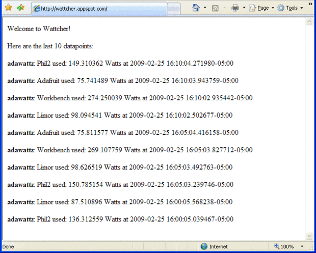 Si fueras a visitar http://wattcher.appspot.com/visquery.json?user=adawattz salida a algo como esto: