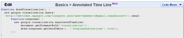 Así tenemos datos y nos gustaría ver nuestra historia de uso de la energía. Graficación de datos es mucho trabajo, y soy perezoso. Así que mira en línea y encontrar que Google - también - tiene una visualización API! Esto significa que no hay que escribir un montón de código gráfico y sólo se puede conectar a su sistema. Dulce!