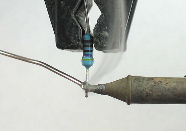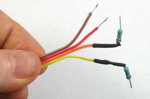 Hacer lo mismo con el cable naranja y la otra resistencia de 4,7 K. Utilice una fuente de calor (una pistola de calor o secador de pelo es perfecto) para reducir el tamaño del termo retráctil sobre el soldada alambre/resistor común. Luego doblar la resistencia 90degrees y enganche el otro extremo de las resistencias de 4,7 k