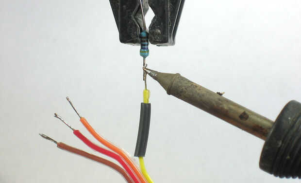 Corte una 1/2" pieza de 1/16" calor encogen y deslice en el cable amarillo, asegurándose de que haya espacio entre el termo retráctil y el extremo del alambre. Luego soldar el cable amarillo a la resistencia de 4,7 k.
