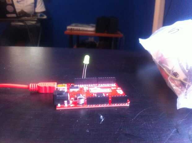 Para este tutorial utilizaré una placa de Arduino Uno. Una luz LED y cable Usb. Coloque el LED de luz en el pin 13. No específicos para el color de LED. El resultado final debe ser como la de la imagen. El pasador corto va en el GND (negativo) mientras que el perno largo en el LED va a pin 13 (positivo).
