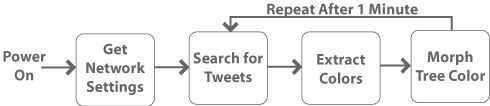 Si se encuentra un nuevo comando de color, el LED se desvanece en el nuevo color. Si se encuentran múltiples comandos o tweets, los colores morph de más antiguo a más reciente, con un segundo 5 pausa entre cada uno. El árbol siempre termina en el color más recientemente Twitter.