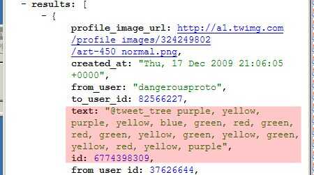 Busca en una máquina de estado análisis de JSON a través de los datos de las etiquetas de 'id' y el 'texto'. El valor de la etiqueta de texto es procesado para comandos de color. También se almacena el valor de la primera etiqueta de identificación. La usaremos para limitar los resultados a nuevos tweets en la próxima consulta. Sugerencia: Pruebe JSONView trabajar con JSON en Firefox.