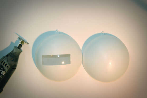 Antes de empezar a pintar, use una Dremel para cortar 2 pequeños agujeros en la parte superior de la bola para antena del Wifly y el cable de alimentación. Luego aplique cinta adhesiva el tamaño de pantalla de LCD (87.3 x 41,8 mm) y comenzar la pintura a pistola. Deje que se seque para empezar un poco antes rellena la bola con la electrónica.
