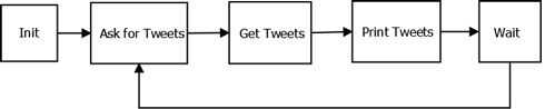 Tweets, nombres de usuario e ID se extraen de una simple búsqueda JSON de la alimentación, se muestra un ejemplo sobre. JSON es una forma de compartir datos como XML, pero de manera más compacta. La plataforma web almacena texto tweet en una matriz gigante. Después de todo se procesan nuevos Tweets, el texto se envía a la impresora.
