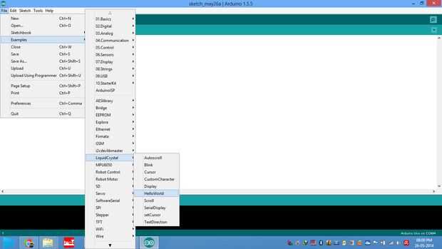 Ahora abrir el programa ejemplos > cristal líquido > Hola mundo como se muestra a continuación.