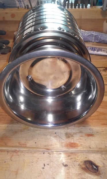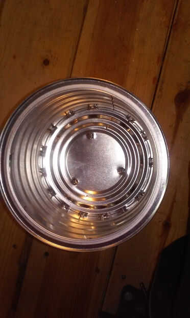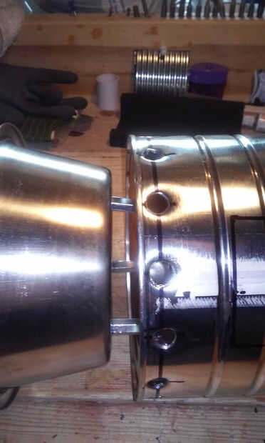 Ahora montamos las piezas de la estufa para darnos la forma única y ver que queremos. En primer lugar, colocamos los tornillos (3 de ellos) a través de la parte inferior de la lata de café (del interior). A continuación, nos Atornille los conectores en los tornillos hasta que la lata inferior se sujeta entre la cabeza del tornillo y el extremo del conector. Utilice un destornillador y una llave para apretar esta articulación.