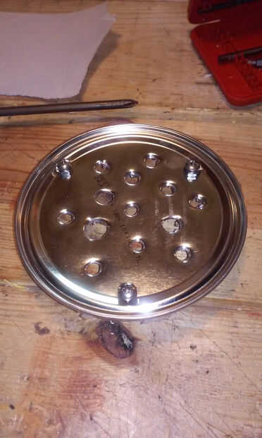 Este simple elemento es el corazón del sistema, y es vital y fácil de hacer. Su propósito es elevar el fuego sobre las entradas de aire, y aire en el centro del fuego. Esto asegura una perfecta combustión y temperaturas caliente , (caliente lo suficiente como para hervir 9 tazas de café en tan sólo 15 minutos con ramas!) Tomamos un pequeño puede superior (o inferior), y tres agujeros espacian alrededor del borde para las piernas vamos a crear. Luego se perfore un patrón más o menos centrado de agujeros (diámetro 1/4") para actuar como los orificios de entrada de aire que aseguren quemadura limpia y calor grave. Como una indicación de qué tan bien funciona esto, tenga en cuenta en la foto de la estufa calefacción mi café, que no hay ninguna llama humo y seria, llevando a cabo, lo que indica una combustión completa. La tapa debe caben cerca del tamaño del café puede obtener interior como usted, pero suficientemente cerca se va a trabajar bien.