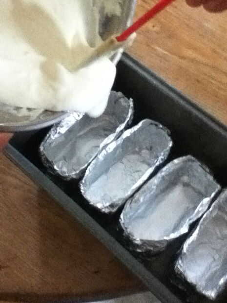 Ponga algunos antiadherente esterilización de las latas de colocarla en un huevo en un tazón separado. Batir la clara del huevo en lo alto hasta que esté espesa y puso de al lado. Mida 4 onzas de mezcla para pastel de libra dorado y dejar a un lado. Poner 1/6ncup de agua en un tazón y añadir la mezcla del bizcocho y mezclar durante 2 minutos. Añadir el huevo y mezclar hasta que quede mezclado. Ahora Llene cada molde de twinkie a 3/4 pulgada de profundidad.