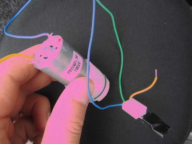 Había montado en un tablero de pan en la parte inferior del bastidor donde puedo ligar todos sus componentes a sus transistores y los transistores a los correspondientes pines del Arduino. Vea el ejemplo en el motor abajo.