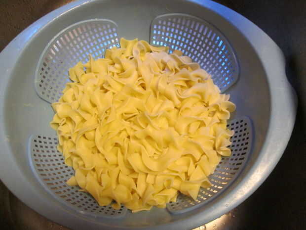 Cuando han transcurrido los cinco minutos, compruebe los fideos y ver si están blandos. Si son, escurrirlas en un colador. También baje el calor de la carne ya que es más probabilidad cocida completamente. Una vez que hayas filtrado y todas esas cosas, usted es seguro comerlo. Y que está sobre él.