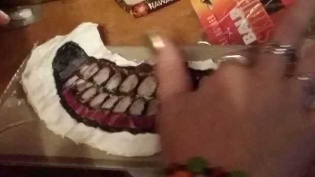 create.the baja máscara cortando un trozo de látex en forma de sonrisa y utilice pinturas de cara para agregar color. Uso alcohol goma para pegar teethe en y pintura al color deseado.
