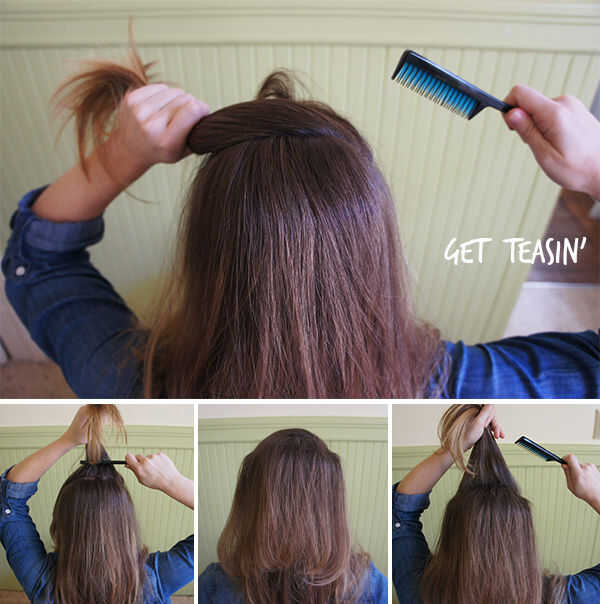 A partir de la corona sección de un trozo y backcomb con un peine de burlas. Usando el peine hacer movimientos hacia abajo hacia su cuero cabelludo. Ir poco a poco, porciones de seccionamiento y burlas, avanzando hacia la parte delantera de la cabeza.