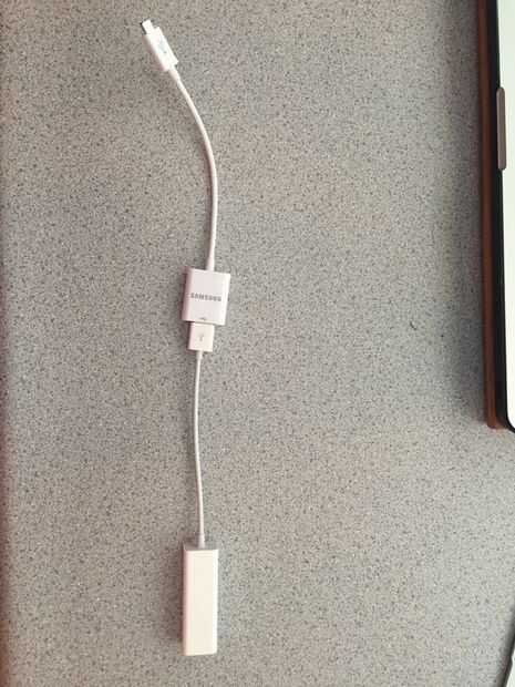 Aquí se puede apreciar el cable Apple USB/Ethernet enchufado con el cable OTG.