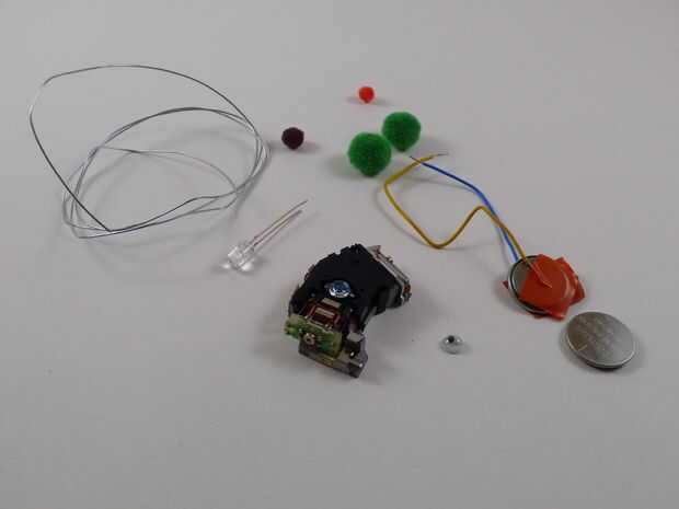 Lo que necesitaremos es un LED, el módulo del laser de lector de CD/DVD, un alambre de metal o incluso una vieja cuerda de guitarra, algunas pilas de botón, algunos cables eléctricos y cinta aislante...