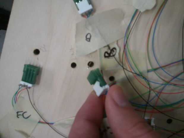 3. Conecte los LEDs a la placa Arduino. Es donde las cosas peludas. Me pareció útil para mantener una lista de las ciudades y cerca de sus correspondientes pernos. Bajé los pines GPIO cableado un cable rojo, luego un cable verde, y luego un cable azul secuencialmente. Al finalizar una secuencia RGB lo es útil utilizar cinta de enmascarar para mantener unida a ese conjunto de cables y etiquetar su ciudad correspondiente. Una vez que estaba abajo para cada ciudad (30 pines en total), cada conjunto de cables RGB a un conector de 4 pines de soldadura y la soldadura en un cable de tierra para completar el conector. Mantener los conectores conectados en el mismo esquema como los LEDs RGB. Las usé fueron tierra de rojo azul verde. El conector cerca de la ciudad correspondiente de la cinta y la cinta para el uso en el paso siguiente de la etiqueta.
