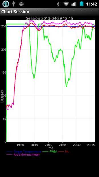 - Aplicación para Android La aplicación monitoriza las temperaturas de termómetro y ajusta la velocidad del ventilador en consecuencia enviando una señal a la IOIO controller. La aplicación utiliza un algoritmo PID para determinar la velocidad correcta del ventilador. Las temperaturas y la velocidad del ventilador se registran en una DB (base de datos) que puede utilizarse para mostrar un gráfico de la cocinera todo. La aplicación es gratis descargar y es Open Source, que quiere decir que siempre será libre.
