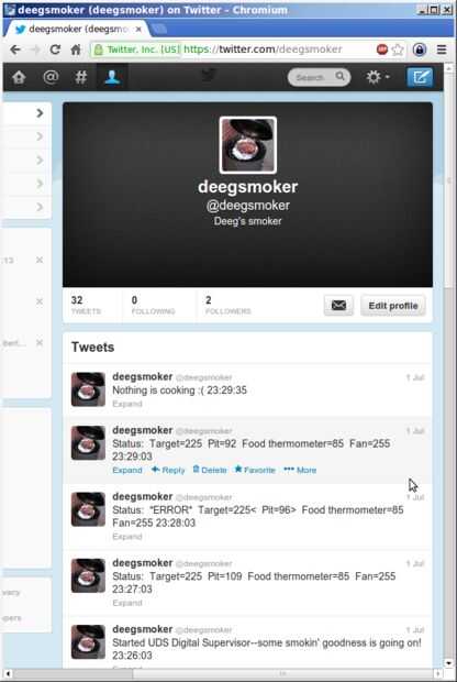 - Tweets periódicamente el estado de su ahumador tan usted puede controlar su cocina desde cualquier lugar del mundo. Requiere una conexión a internet (doble duh). Si usted necesita algo para ponerse a dormir puedes seguir mi cuenta de twitter del fumador.