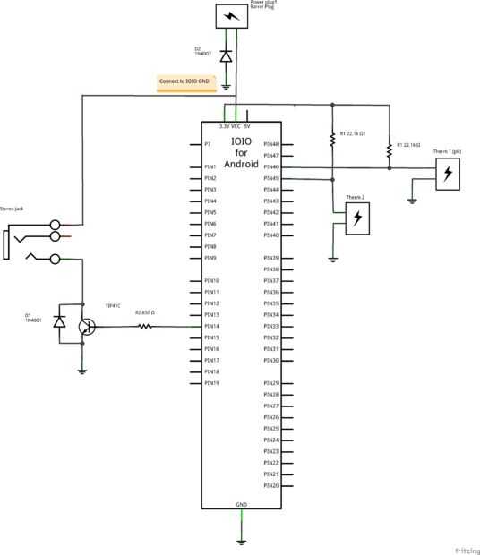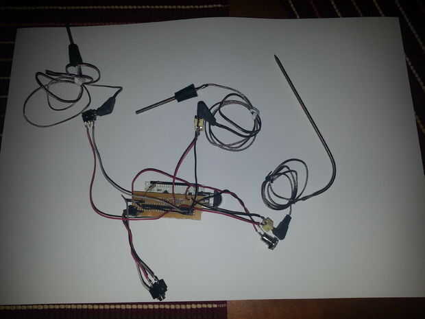 Comience agregando el circuito para uno o dos termómetros. Cuando se tiene atado con alambre para arriba que puede iniciar el Supervisor y conectarlo a la IOIO. Usted debe ser capaz de leer correctamente los termómetros. Una vez que trabajan agregar los cables de los otros termómetros. Usted debe tener al menos dos termómetros y puede tener un máximo de seis. El termómetro del "hoyo" es el conectado al pin 46; Este es el que el controlador se utiliza para emparejar a la temperatura deseada. Pernos de 45-41 corresponden a termómetros 2-6.