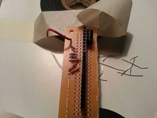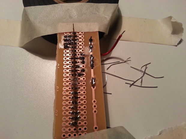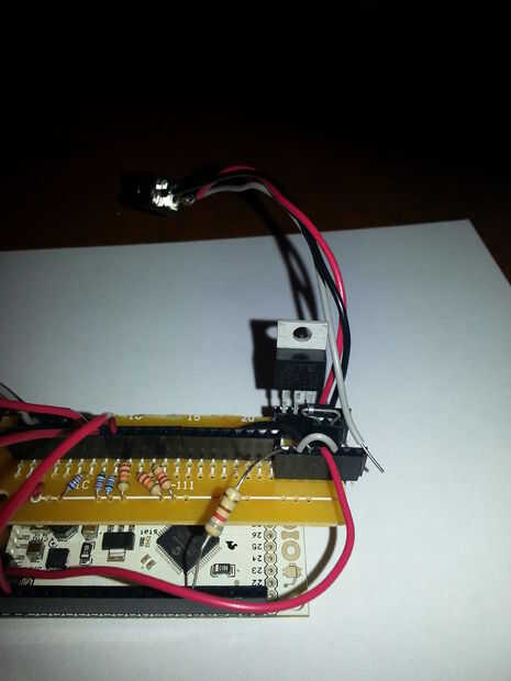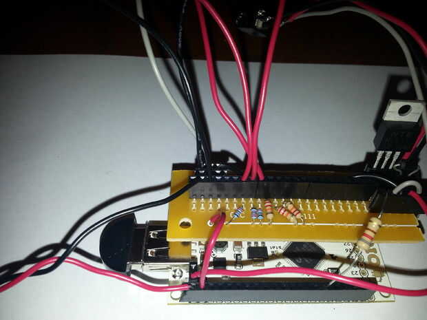 Ahora viene la parte difícil: soldadura y cableado de los conectores de termómetro y poder el IOIO. Para hacerlo más fácil soldado las cabeceras de Arduino a la placa de circuito. Los pernos en las cabeceras de Arduino son más largos y calcen bien en las cabeceras que se sueldan a la IOIO. Ver las fotos. Al insertar los pines de Arduino en la cabecera el Asegúrese de IOIO Alinee correctamente. Tendrá que recortar la placa de circuito; Si es así dejar un margen en un extremo para la celebración de los circuitos del ventilador.